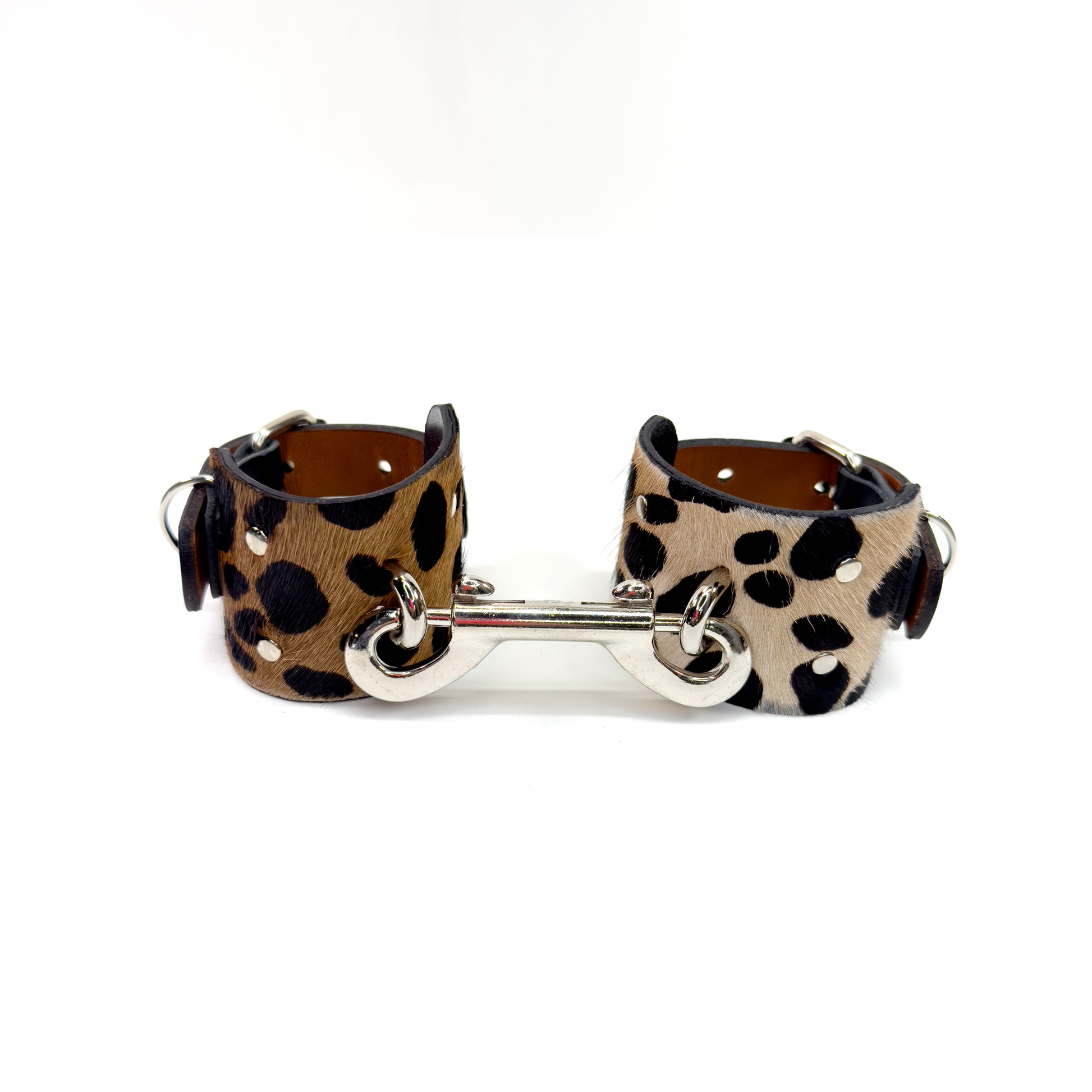Handcrafted from reclaimed luxury leather scraps. Soft black leather is layered with leopard printed hair-on hide and finished with hand-set silver hardware, creating a piece that feels both ritualistic and refined.